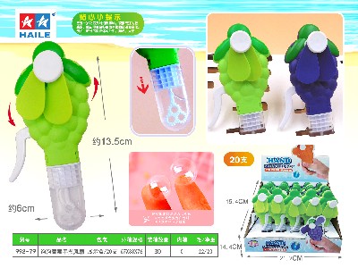 2色混||产品大小(CM):13.5X3X6||彩盒大(CM):21.2X14.4X15.4||这是一款非常有趣的手握风扇,拿在手里面,其手握开关带动叶片,风力很大的哦不用电池不用电,只要手握就行,健康又环保,让你清凉一夏另加吹泡泡功能更好玩.. |